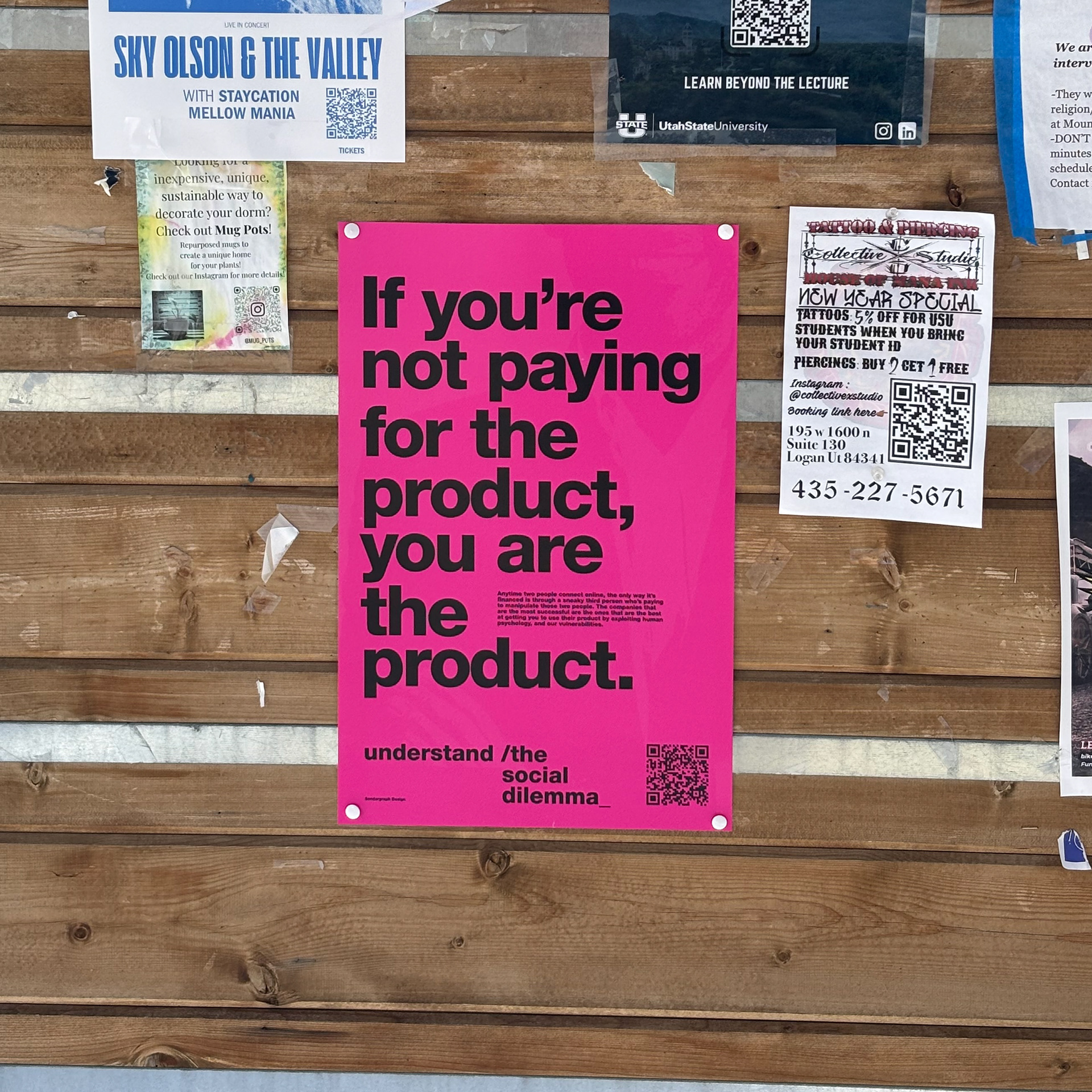 These posters were inspired by the Netflix documentary "The Social Dilemma". They were displayed on USU's main campus in 2024 as a social change campaign.