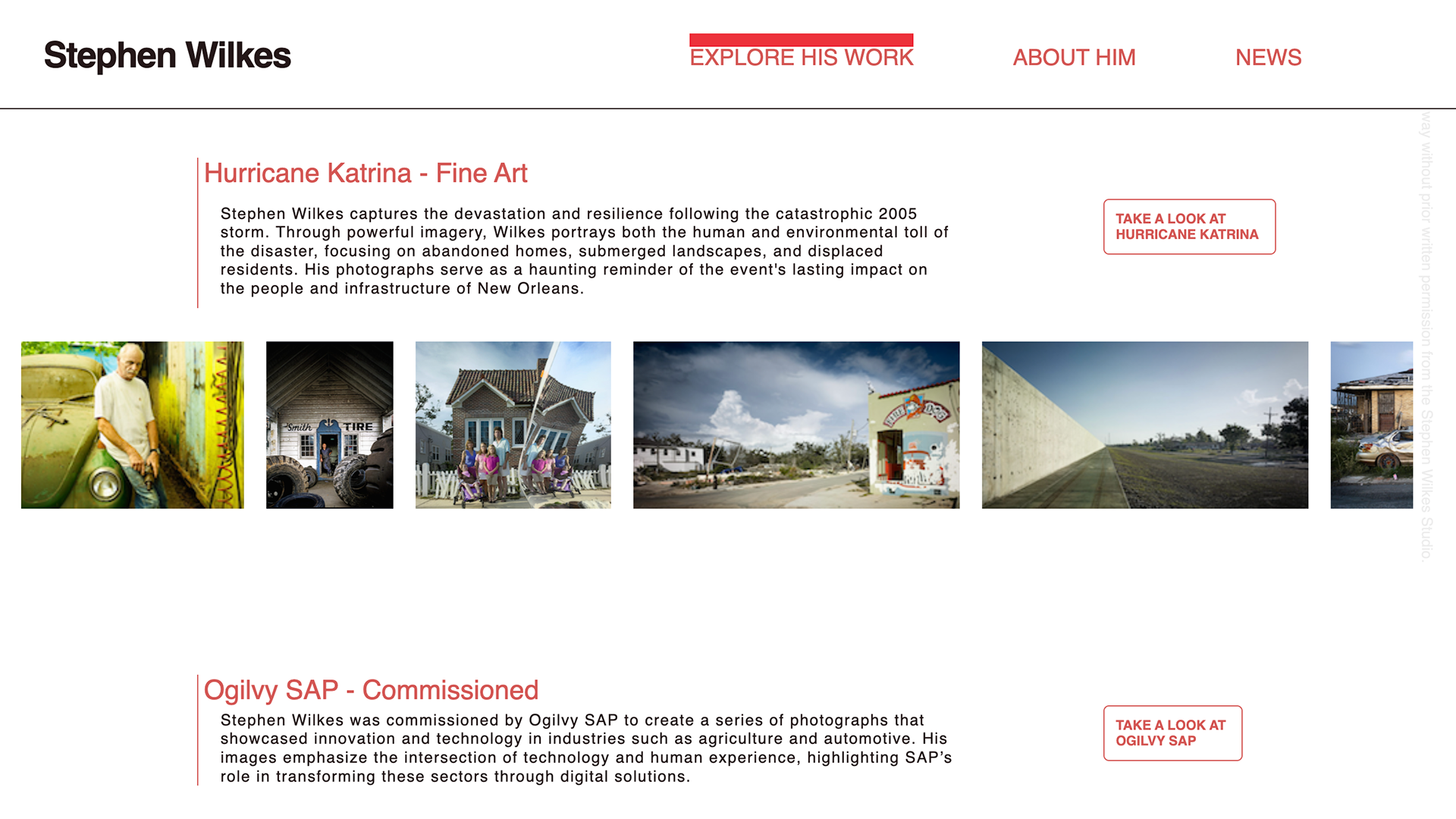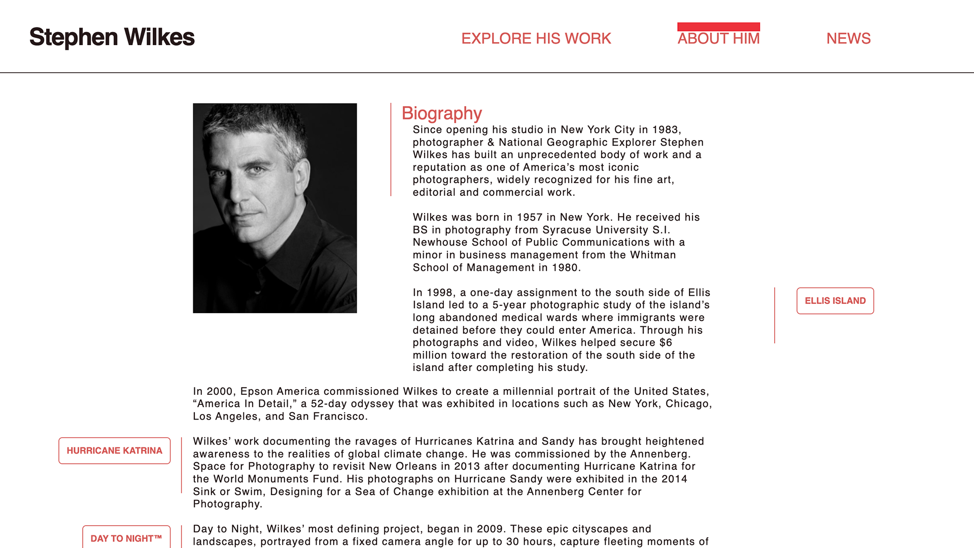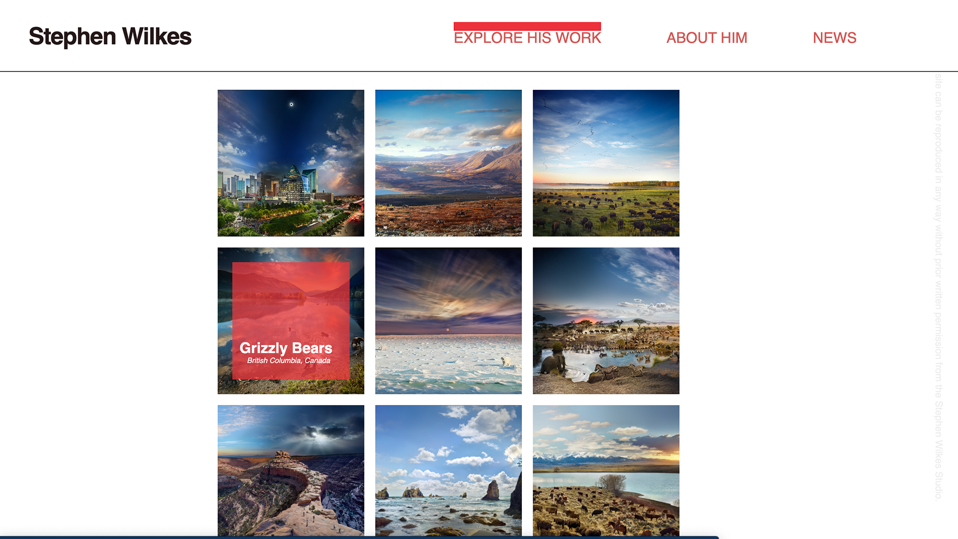 Stephen Wilkes is an American photographer, photojournalist, director, and fine artist. This is a speculative redesign of his portfolio website. This is a static website to be viewed on a desktop.